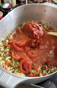 Stir in the tomato sauce, stewed tomatoes (with juices), and tomato paste. Mix well to combine with the sautéed aromatics.