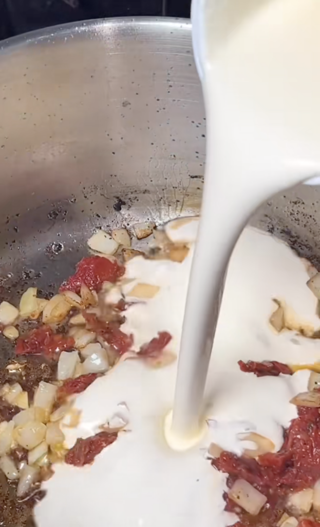 • Pour in heavy whipping cream and season with dried basil, dried oregano, salt, and black pepper. Bring to a simmer and let cook for 5-7 minutes, or until the sauce has thickened slightly.