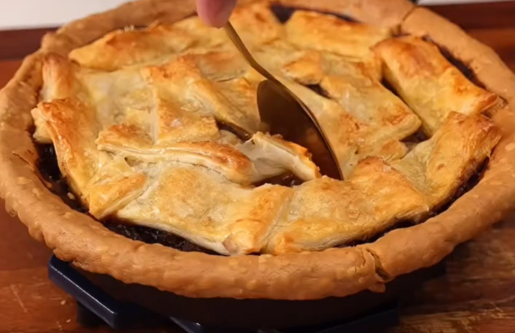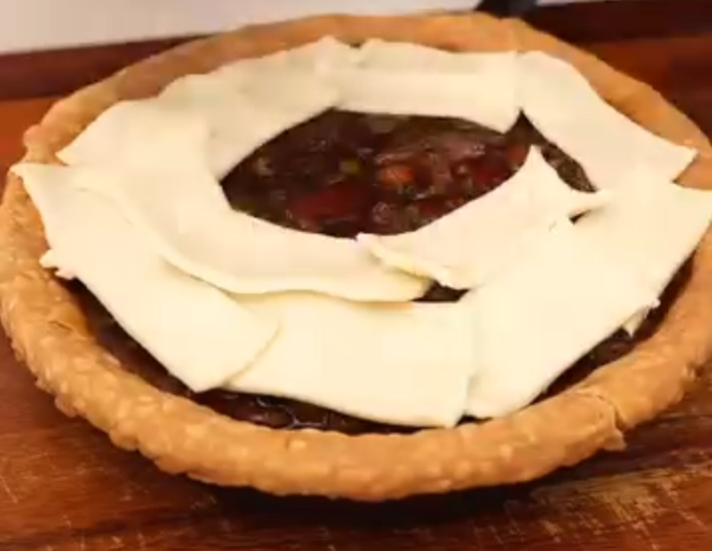 - Roll out the puff pastry and place it over the filling, sealing the edges.