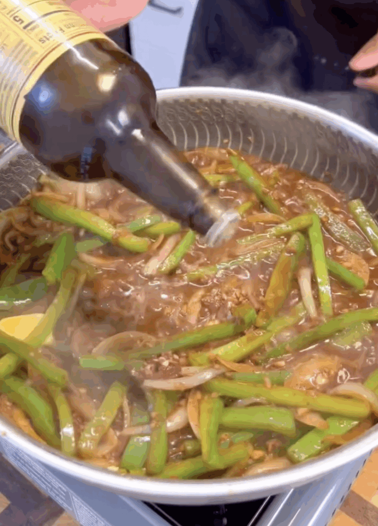 • Pour in red wine, add Worcestershire sauce, butter, and the beefy onion soup packet.