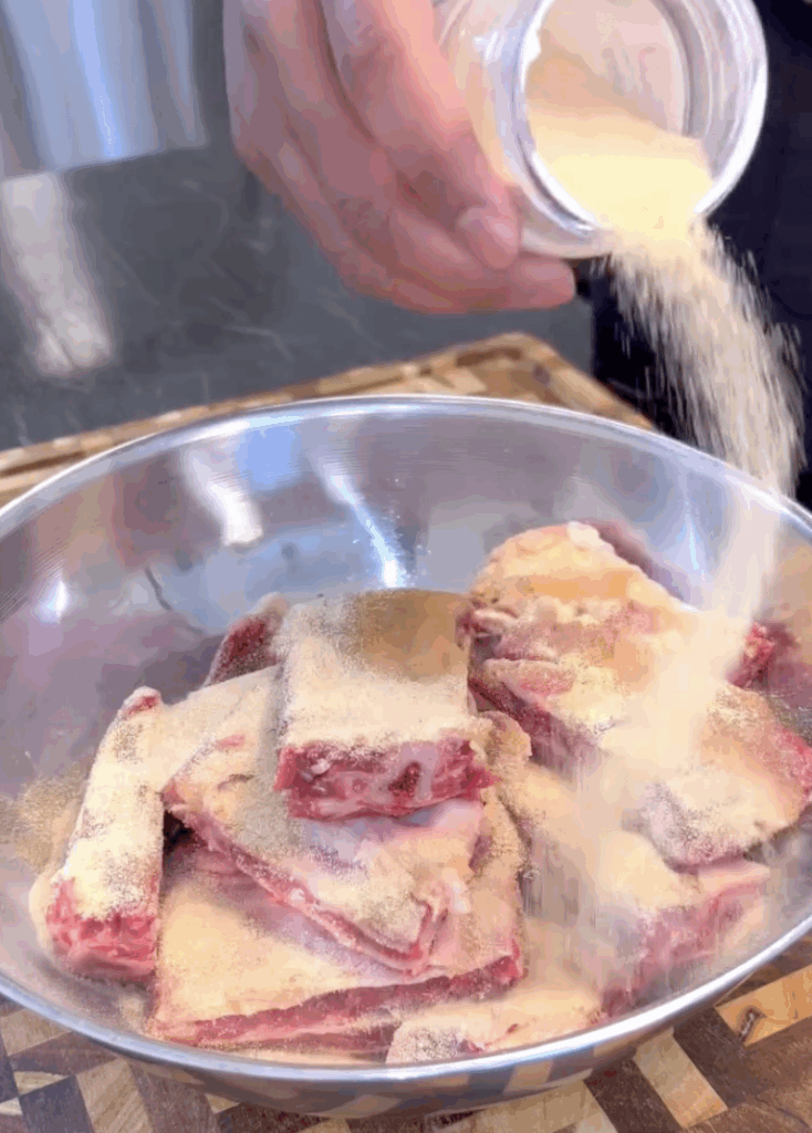 • Coat ribs with olive oil and generously season with onion powder, garlic powder, paprika, Creole seasoning, Nature’s seasoning, and Italian seasoning.