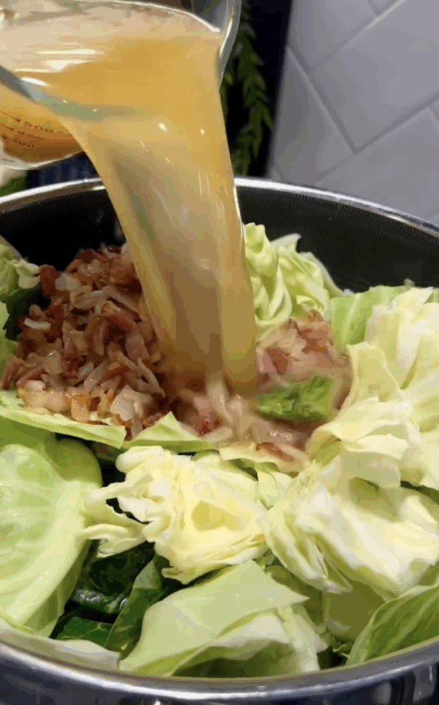- Add cabbage, bacon-onion mix, sugar, Cajun seasoning, and chicken broth to the pot.