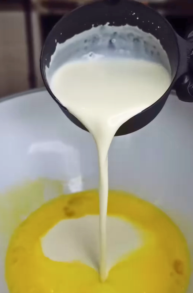 - Pour in ⅓ to ⅔ of the milk mixture.