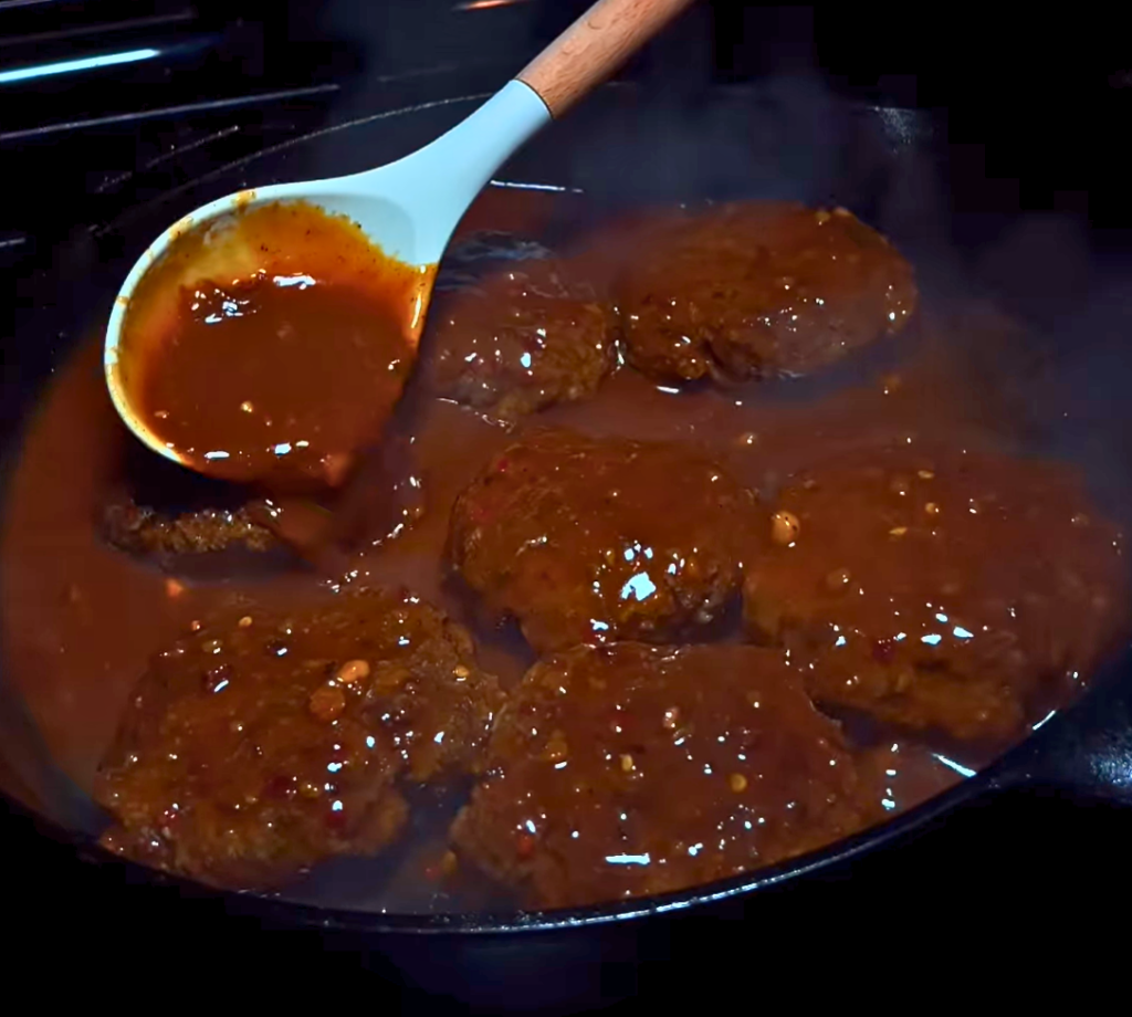 - Cover and simmer on low heat for 15–20 minutes, or until patties are fully cooked (160°F internal temp).