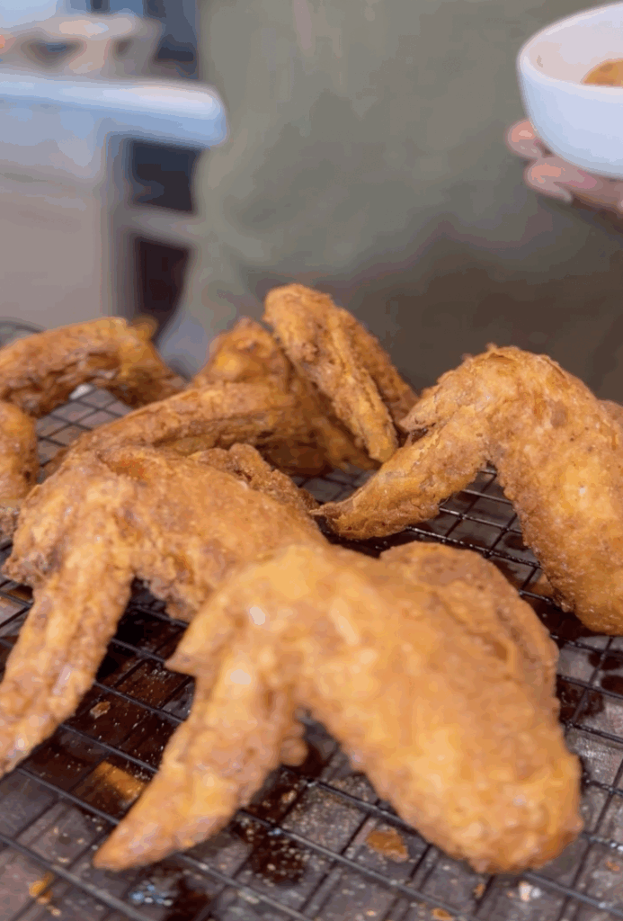Shake off excess flour, place wings on a wire rack, and let them rest for 10–15 minutes so the coating sets and crisps up better when frying.